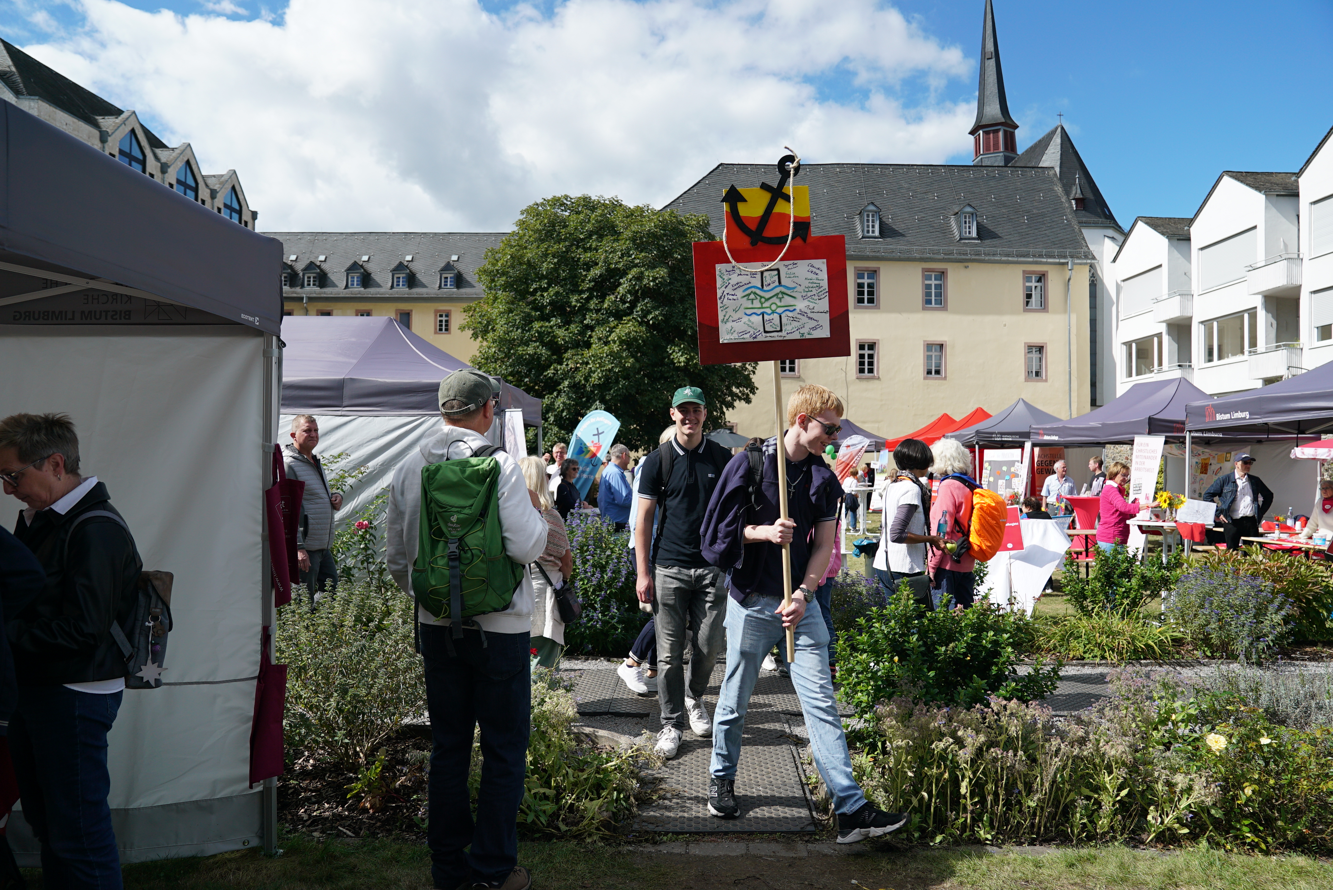 Angekommen in Limburg erwartete die Pilgerinnen und Pilger ein farbenfrohes Fest. Im Bischofsgarten luden eine Hüpfburg, ein Barfuß- und Balancierparcours und kreative Mitmachstationen Kinder und Familien zum Toben und Gestalten ein. Jakobsmuscheln wurden bemalt, Kreuze gebastelt, Workshops zu Achtsamkeit besucht. Der „Bistumsexpress“ verband den Bischofsgarten mit der Bistumsmeile auf der sich Verbände, Initiativen, Institutionen und zum ersten Mal auch die fünf Regionen des Bistums präsentierten und das vielfältige Leben der Kirche im Bistum Limburg zeigten.
